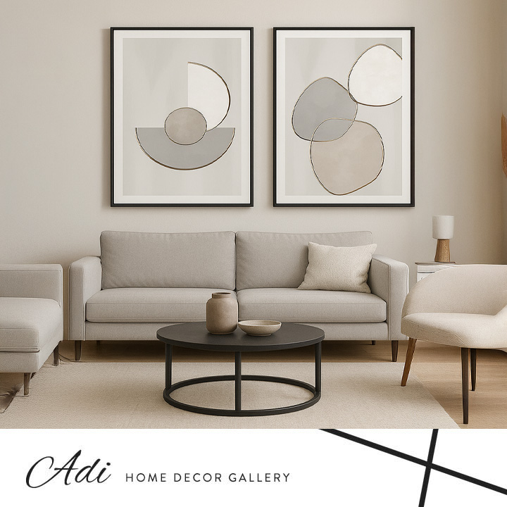 זוג תמונות קנבס  אבסטרקט מודרניות בעיצוב גאומטרי מינימליסטי, עם צורות עגולות ומחולקות בקווים עדינים וזהובים.